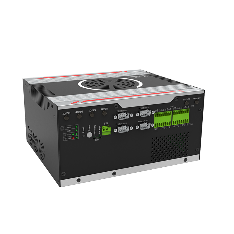 與豎向等多種放置的自然對流散熱,機箱可抗接觸式6KV強電磁干擾,DC12V-24V寬壓輸入接口豐富:4*LAN(Intel),6*COM,24*GPIO(12*GPI,12*GPO,帶隔離),7*USB3.0+1*USB2.0,1*VGA,
